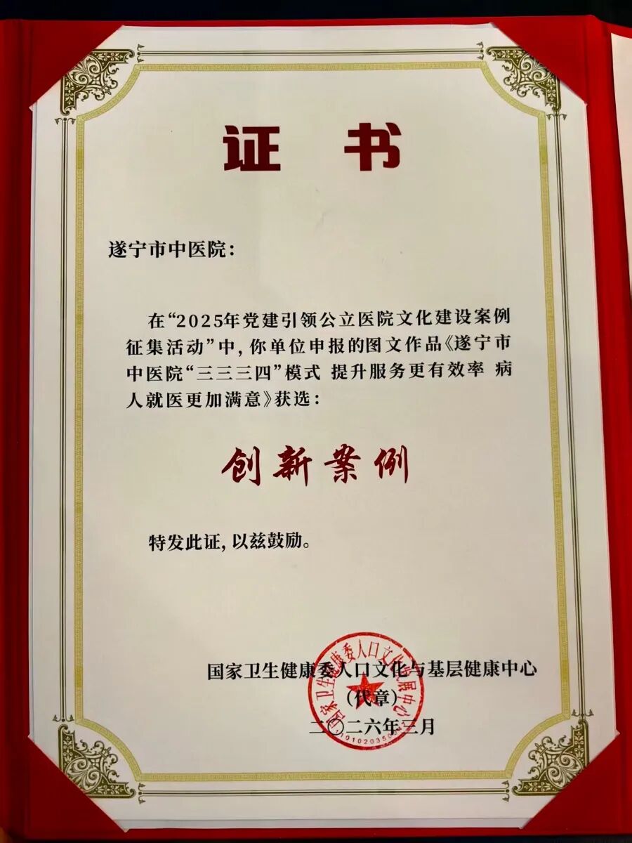 2026年3月28日,由国家卫生健康委人口文化与基层健康中心、中国家庭报社联合主办,中国卫生健康思想政治工作促进会支持的“2025—2026年党建引领公立医院文化建设经验交流活动”在广西南宁举行。来自全国19个省、自治区、直辖市的140家医疗机构代表齐聚一堂,交流探讨党建引领公立医院文化建设高质量发展新路径,同时评选了一批“党建引领公立医院文化建设”优秀案例,遂宁市中医院选送的《“三三三四”模式: